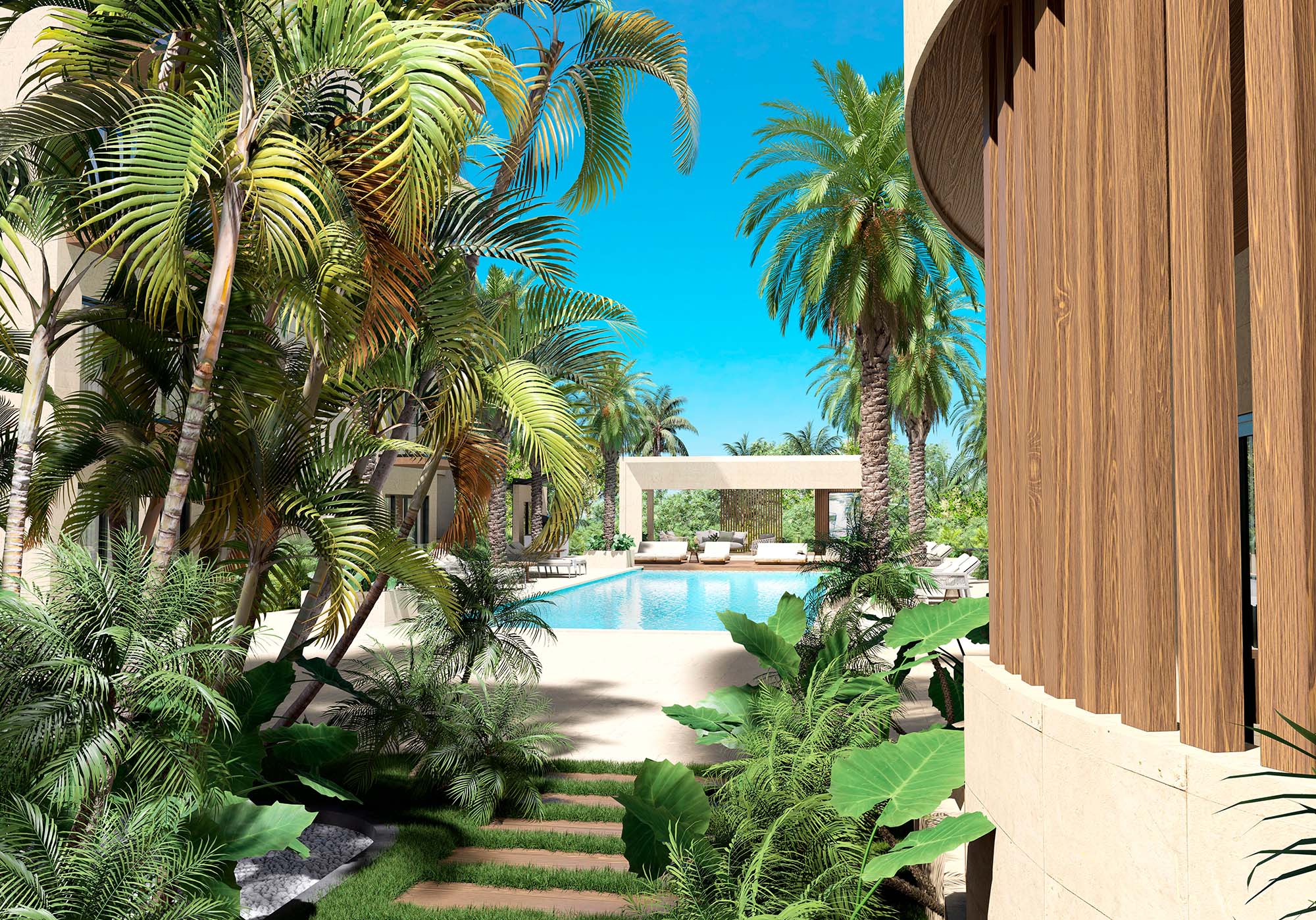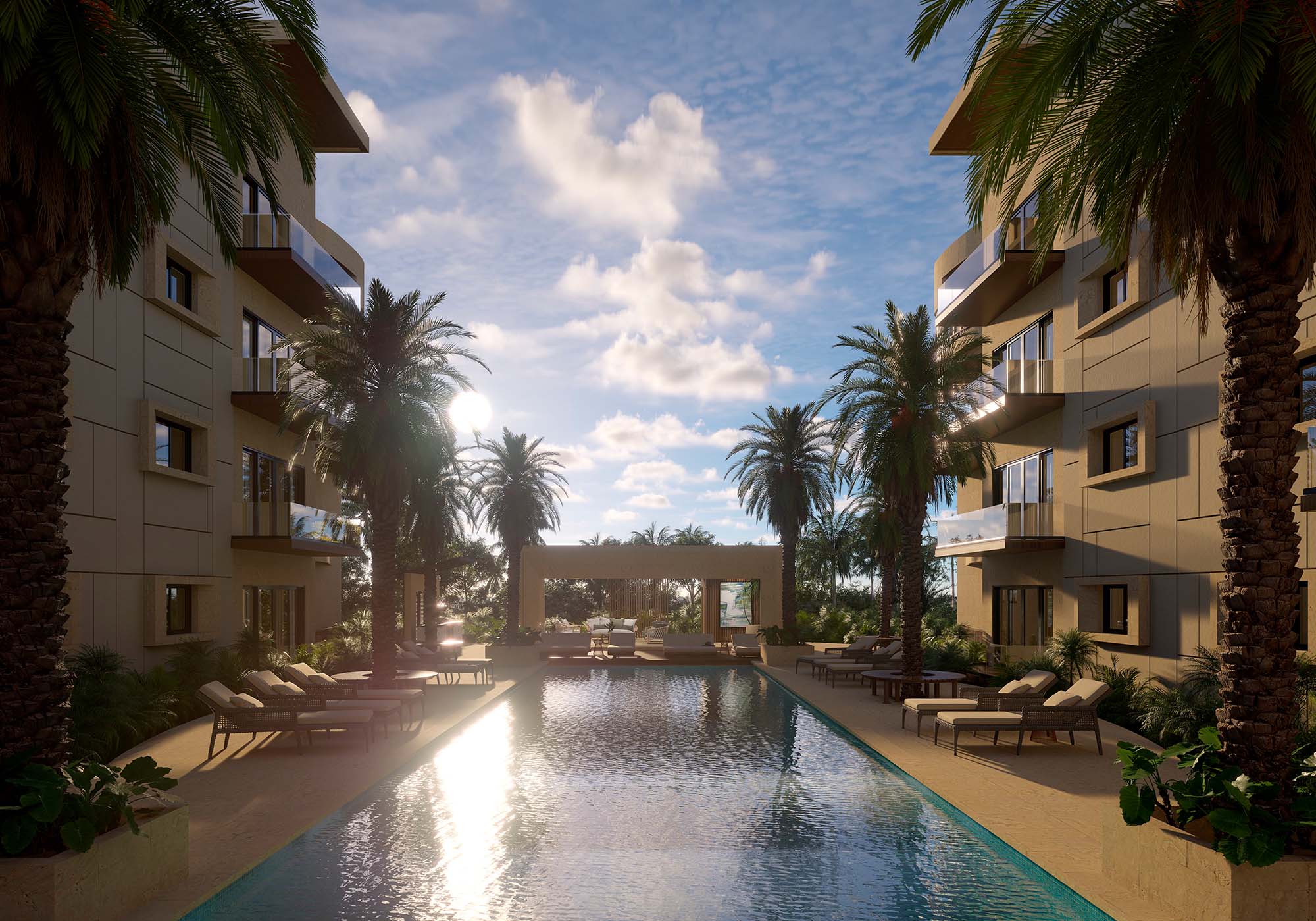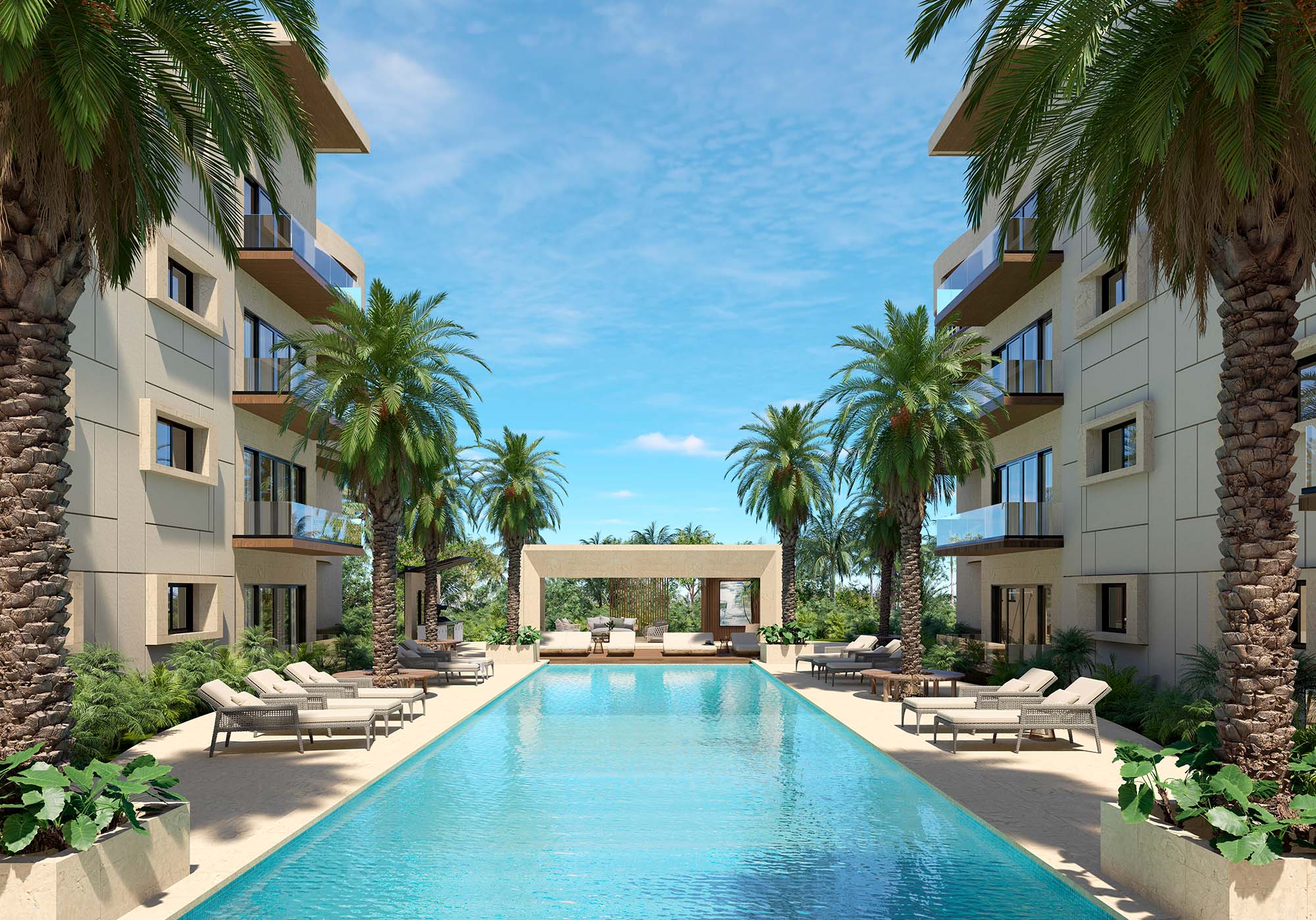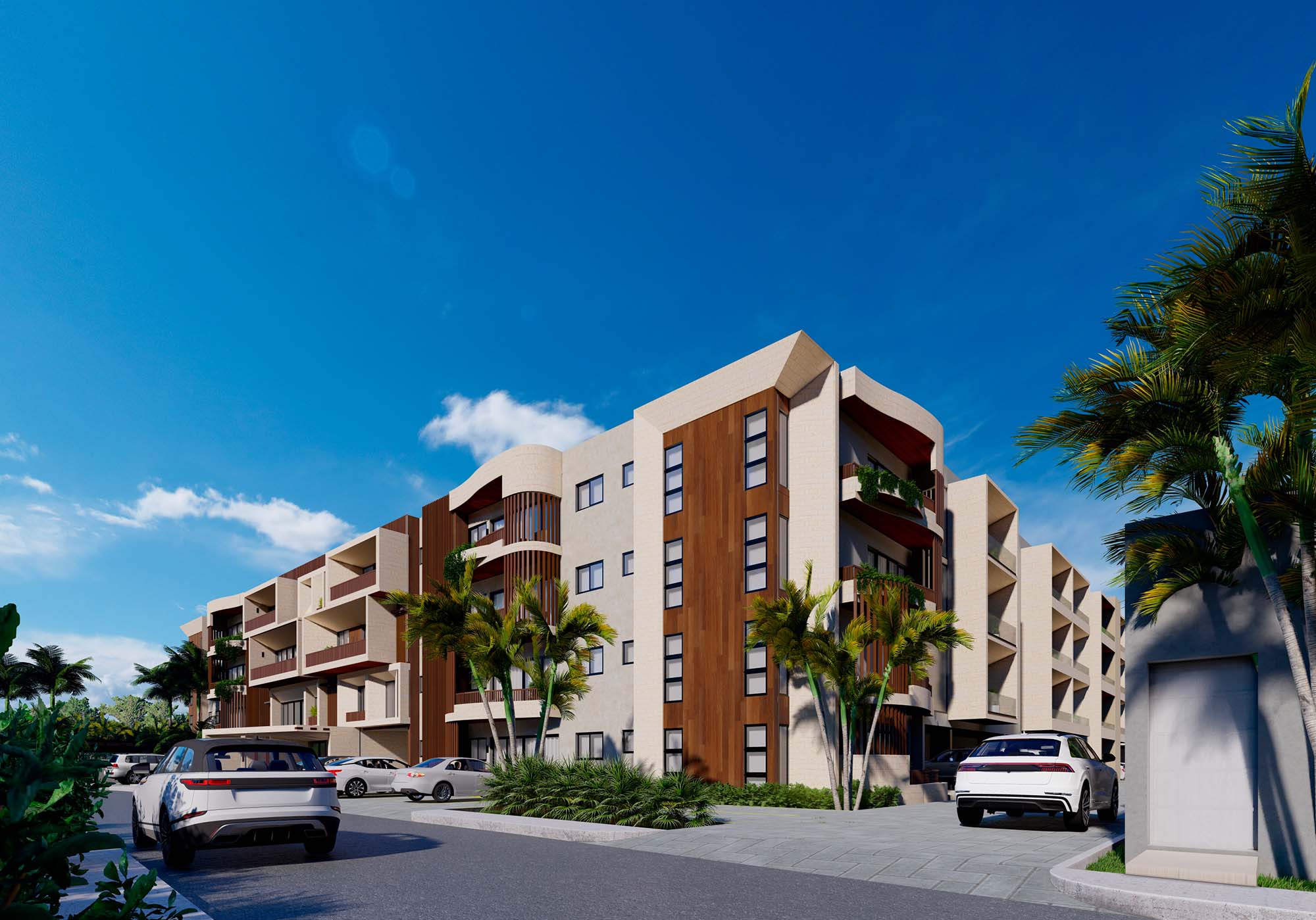 a residential development composed of 1 and 2-bedroom apartment buildings, as well as a wide range of ample proposal of amenities combining recreational areas, BBQ, gazebo(s), children’s area, swimming pool for children and adults, gym, dog park and lounge area. It is located in the residential development project Las Canas, Cap Cana. It has a Northeast front of approximately 87.79 linear meters facing the access road.